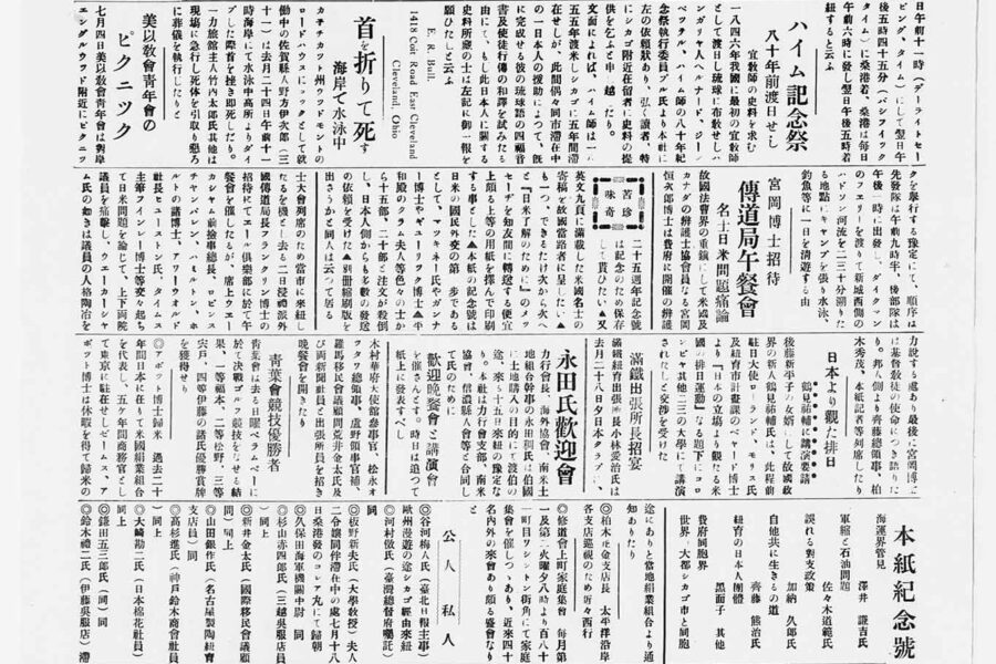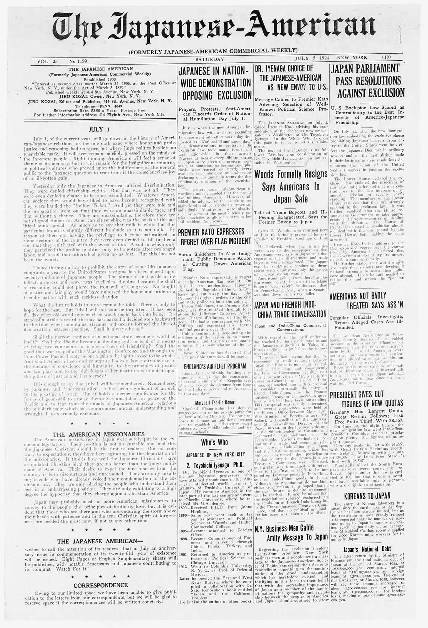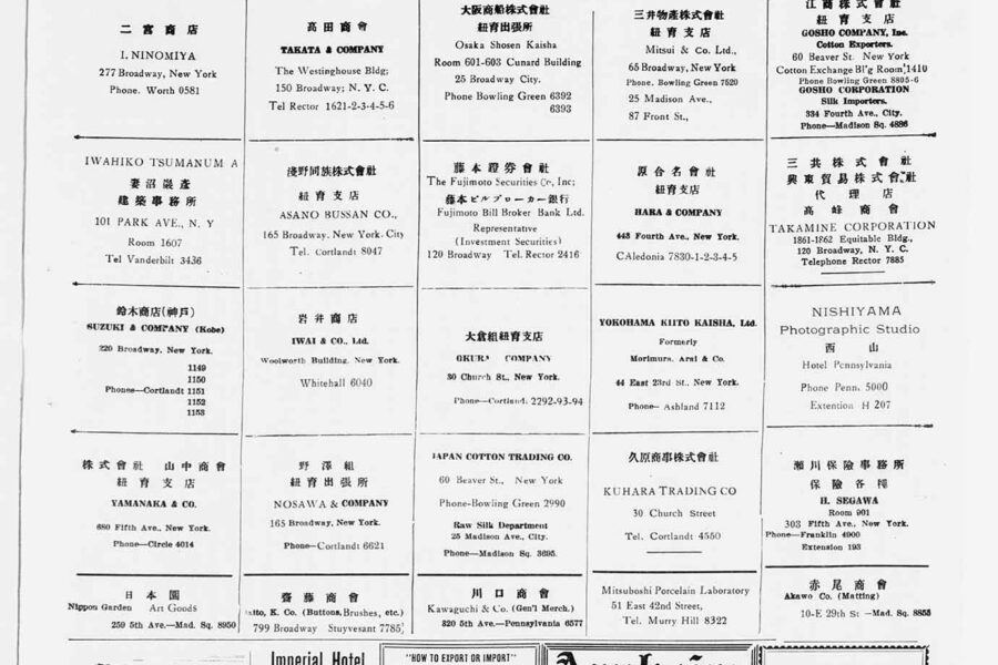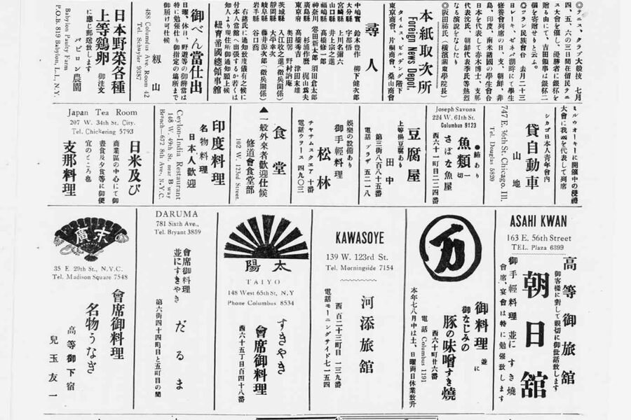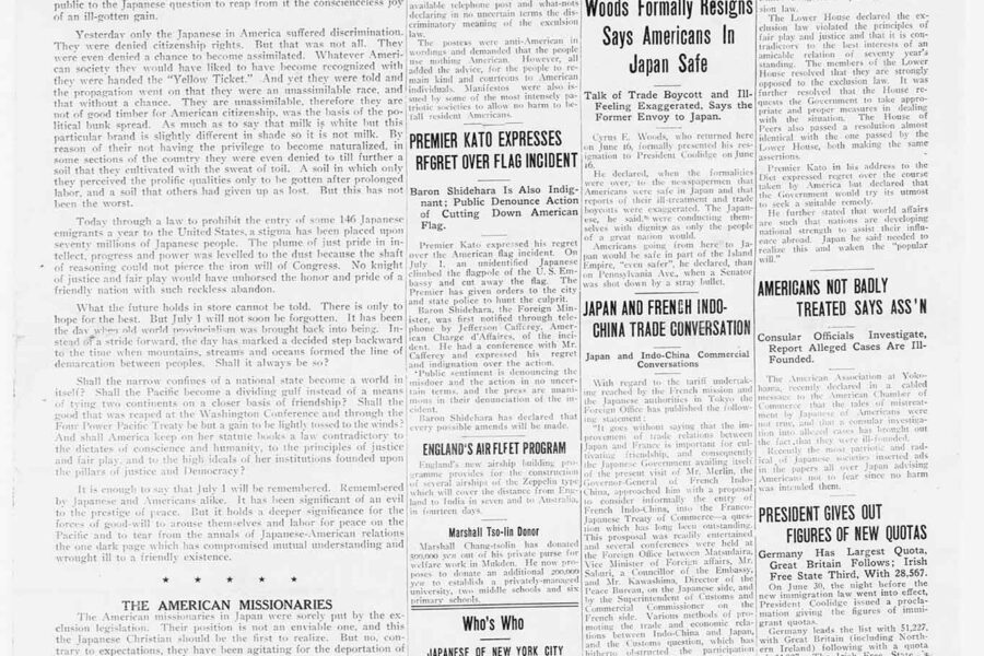 Founded in 1900, the Nichibei Shūhō (later renamed Nichibei Jihō; English name: Japanese American Commercial Weekly) was the first long-running Japanese newspaper issued in New York. It continued to publish for more than 40 years until the U.S. government ordered it to cease publication in 1941. An article published on July 1, 1924, described the protest against the Immigration Act of 1924, which banned immigration from countries throughout Asia, including Japan