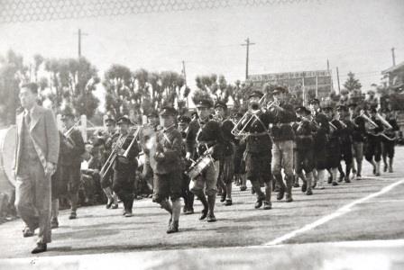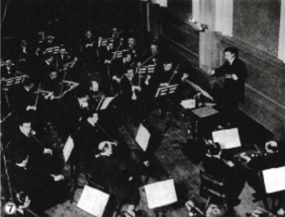 アジア太平洋戦争期における日本の音楽制度の変容は、山田耕筰の音楽報国隊(音楽奉公隊)といった専門家組織にとどまるものではなかった。 全国各地の学校吹奏楽部、青年オーケストラ、市民合唱団にまで軍隊式の訓練体系が導入され、陸軍軍楽の伝統を踏まえたレパートリーが採用された。 これらの団体は行進曲や国歌を演奏し、士気を鼓舞するとともに、国家への集団的忠誠を音楽によって体現した。 東邦商業学校音楽部のこの写真は、まさにその時代の空気を映し出している。 若い音楽家たちは、芸術家であると同時に、音による戦時動員の象徴的な担い手として練習と演奏に臨んでいたのである。