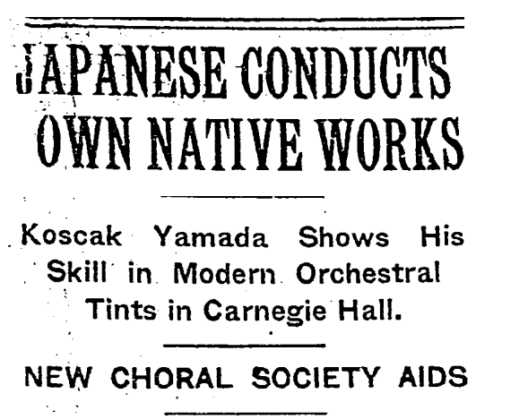 1918年から1919年にかけて、同盟国フランスと日本が二夜続けてニューヨークで自国の音楽を披露した。 山田耕筰の演奏会はフランス管弦楽団の公演の翌晩に開催され、メトロポリタン歌劇場、フィルハーモニック、シンフォニー・ソサエティの楽員に加え、ニュー・コーラル・ソサエティの百名を超える合唱団が共演した。 1918年10月17日付のニューヨーク・タイムズ紙は、この公演を「アメリカの地における芸術における東西同盟の初の出会い」と評している。
